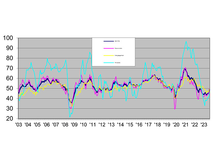 Deze ontwikkeling was het gevolg van kleinere dalingen van productieomvang, aantal nieuwe orders en werkgelegenheid. Het ondernemersvertrouwen was ondertussen aanzienlijk groter dan vorige maand en een groter aantal producenten ging ervan uit dat hun productie in de komende twaalf maanden zal groeien.