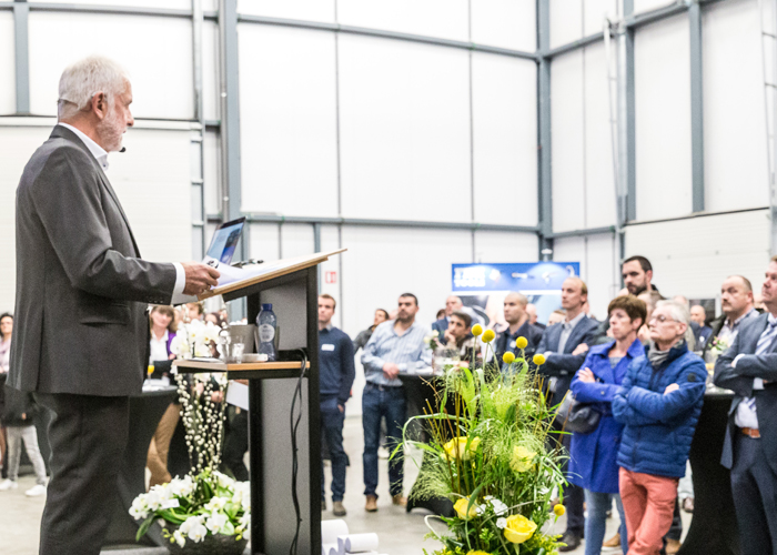 - CEO Dominique Gilles spreekt de genodigden toe. Meer dan 250 sympathisanten maakten van de receptie een gezellig multidisciplinair netwerkmoment.