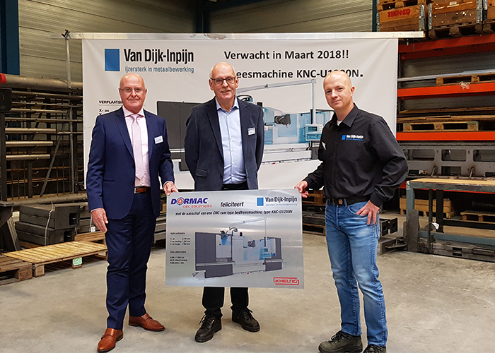 - Namens Dormac feliciteert Ruud Dubbeld (links) technisch directeur Dirk van Dijk en voorman verspaning Jeroen Verheij van Van Dijk-Inpijn met de aankoop van de CNC Ram type bedfreesmachine KNC U1200N van Kiheung.