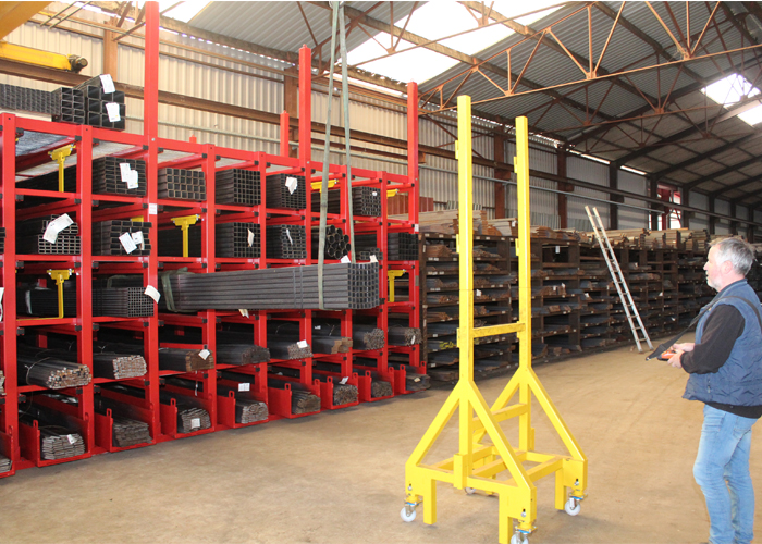 De basis van het Spaanse opslagsysteem is een eenvoudige, robuuste, in principe aan beide kanten toegankelijke stellage met verschillende compartimenten. Langgoed met een lengte van 6 à 7 meter kan hier eenvoudig worden ingeschoven en uitgenomen, zo leerde de demonstratie bij Booischotse Metalen. Met behulp van een kraan en een strop (kan ook een magneet zijn) wordt een bundel materiaal opgepakt. Deze wordt recht voor het juiste compartiment gehangen en ondersteund door een mobiele supportwagen en een verplaatsbare beugel in het compartiment. Vervolgens wordt de bundel moeiteloos het vak ingeschoven, waarbij de beugel naar achteren schuift. Het uit de stelling halen van de bundel gaat even eenvoudig.