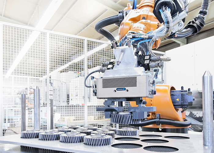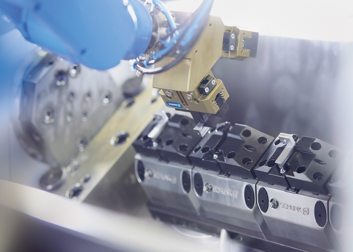 - Volautomatisch teamwork van Schunk spanmiddelen en grijpsystemen: met het klauwensnelwisselsysteem Pronto wordt deze klauwplaat binnen enkele seconden aangepast aan nieuwe onderdelen.