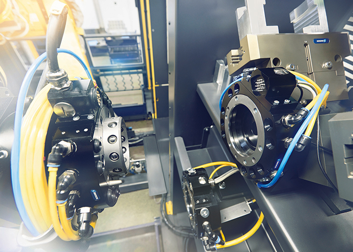 - Deze hydraulische gereedschapshouder (rechts) is direct op de krachtbediende Rota THW klauwplaat geplaatst en maakt een nauwkeurige opspanning mogelijk. De Schunk-ladinggrijper is voorzien van kunststofklauwen wat het oppervlak van de precisie-onderdelen ontziet.