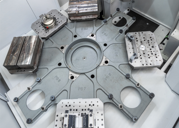 - De werkruimte van de bewerkingscentrum C 22 UP met de zwenkbare ronde tafel met 320 mm diameter (assen A en C) voor de 5-assige complete/simultane bewerking van gereedschapscomponenten in een opspanning.
