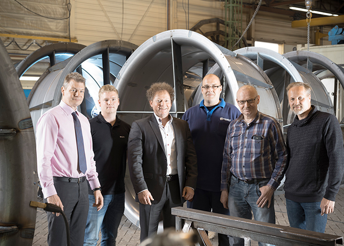 - Het team bij Geha. V.l.n.r. Franc van Wilgen (directeur Geha), Benedict Menningen (EWM), John de Boer (eigenaar Geha), René Timmer (servicemedewerker Kumoweld), Bertus Vinke (lascoördinator Geha), Pieter Tent (manager technische dienst). (Foto: EWM)