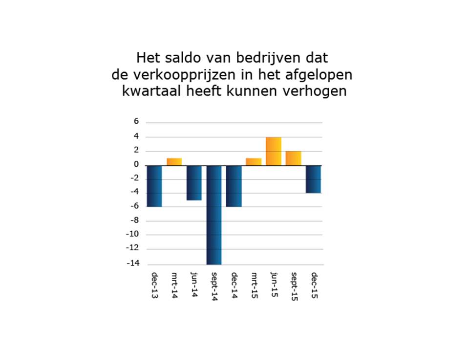 Na drie kwartalen van een lichte prijsstijging zijn er in het 4e kwartaal weer iets meer ondernemers die hun prijzen hebben moeten verlagen (13%) dan er ondernemers waren die de verkoopprijzen konden verhogen (9%).
