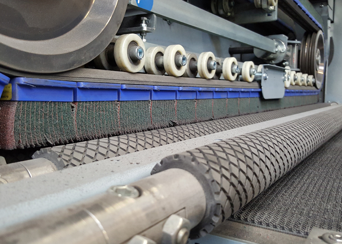 Lissmac heeft dat opgelost door direct aan het begin van de machine een extra (vierde) invoerrol te plaatsen, die 2 cm hoger zit dan de andere doorvoerrollen. Deze rol is nodig om te voorkomen dat de opstaande platen in het rubber prikken en zo het rubber kapot maken. Nu wordt de opstaande plaat door de extra rol naar beneden gedrukt. Ook zijn de rollen uitgerust met dubbel dik rubber, zodat de kommetjes het niet beschadigen.