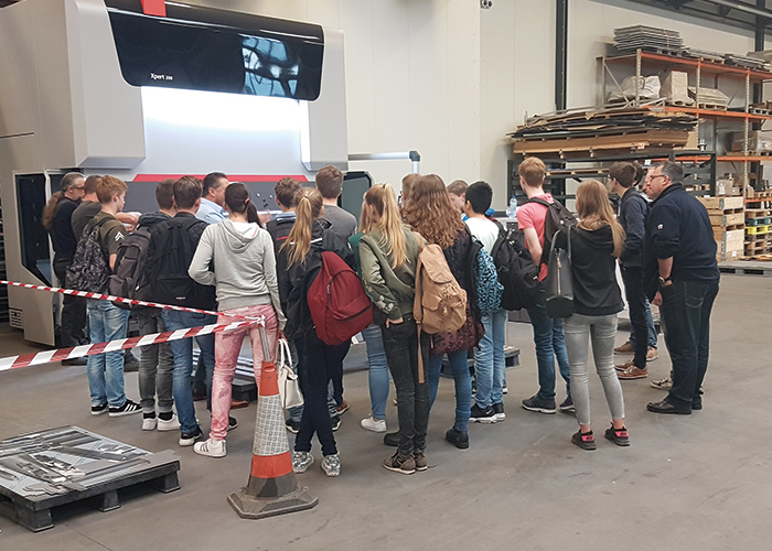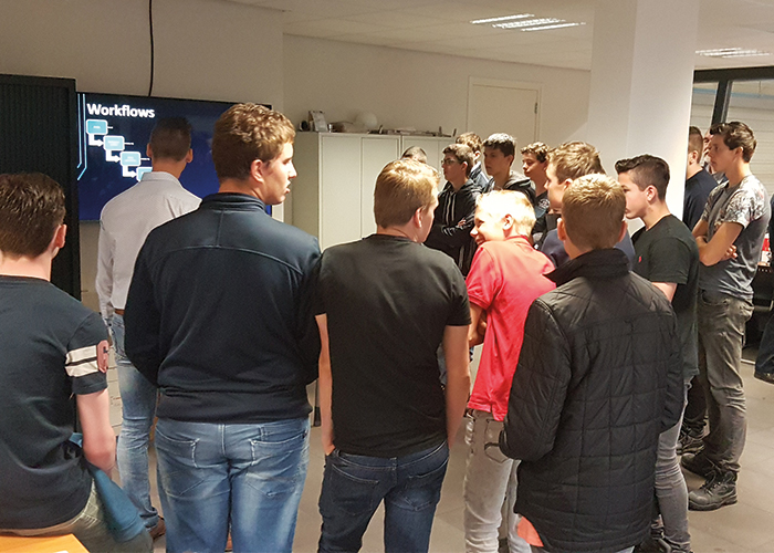 - Directeur Peter van Knippenberg legt aan de leerlingen uit wat er allemaal mogelijk is in zijn machinepark