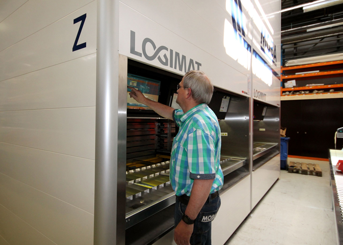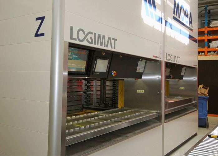 De LogiMat is een geautomatiseerde opslag- en orderverzameloplossing op basis van het goods-to-man principe. In deze ladekast met twee rijen trays worden de assemblage onderdelen voor de eisorteer- en verpakkingsmachines, voornamelijk elektronische en pvc componenten, compact opgeslagen. Moba heeft in totaal zo’n 24.000 artikelen op voorraad, waarvan 14.500 artikelen opgeslagen in zes plateauliften.