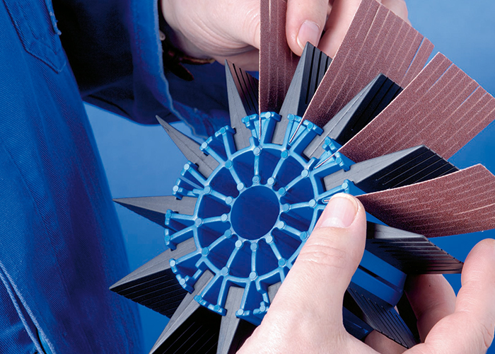 Pferd heeft voor dit bewerkingsprobleem met het Poliflap-slijpwiel een effectieve en eenvoudig te bedienen oplossing ontwikkeld, waarmee plaatstaal, meteen vlak, convex of concaaf wordt bewerkt en streepbeelden hersteld kunnen worden. Â Het systeem bestaat uit een herbruikbare drager (op stift), waarin afwisselend slijp- en rubberen lamellen geplaatst worden.