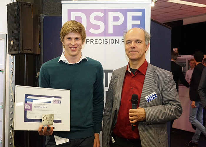 De Precisiebeurs werd traditioneel afgesloten met de uitreiking van de Wim van der Hoek Award door DSPE. Deze award beloont het beste afstudeerproject op het gebied van precisiemechatronica of het ontwerp van mechanische structuren. Dit jaar maakten maar liefst negen genomineerden kans. Sam Peerlinck, student aan KU Leuven, won met zijn project: ‘Asymmetrisch bewegende cilia voor vloeistofpropulsie bij lage Reynoldsgetallen: een fysisch model’.