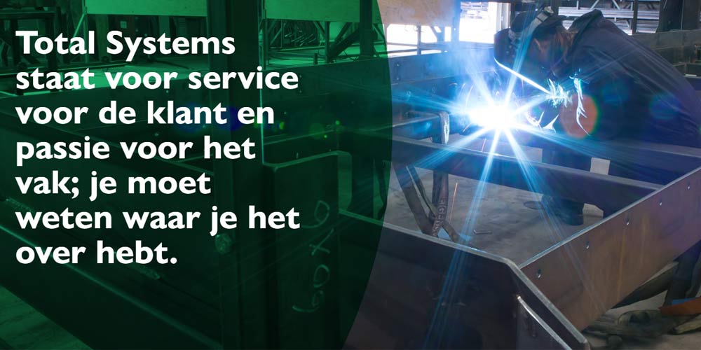 Total Systems is specialist in het ontwerpen, ontwikkelen en bouwen van geavanceerde, compleet geautomatiseerde machines en verwerkingslijnen voor de bloembollen- en bloemensector, de agrarische sector en de industrie. Zij levert een compleet programma aan sorteer- en verwerkingsmachines. Met een team van uiterst ervaren adviseurs, ontwerpers en monteurs wordt volgens de wensen van de klant een individuele machine of complete lijn op maat ontworpen. De vraag van de klant wordt vertaald in een 3D-ontwerp, waarna de productie van start gaat. Snelheid en kwaliteit zijn gewaarborgd doordat alles onder één dak gebeurt. Zo ontstaat er een kwalitatief hoogwaardig en uniek eindproduct, dat jarenlang het beoogde rendement oplevert. Total Systems neemt het volledige bedrijfsproces onder de loep en realiseert daarmee een optimaal resultaat, toegespitst op de individuele behoeftes van de klant.