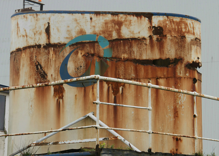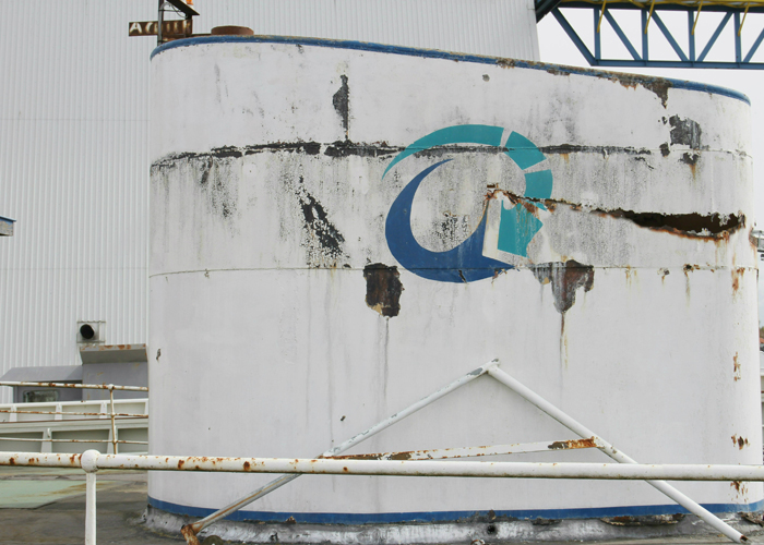 - Schoorsteen schip met roest en roeststrepen en schoorsteen na roestbehandeling.