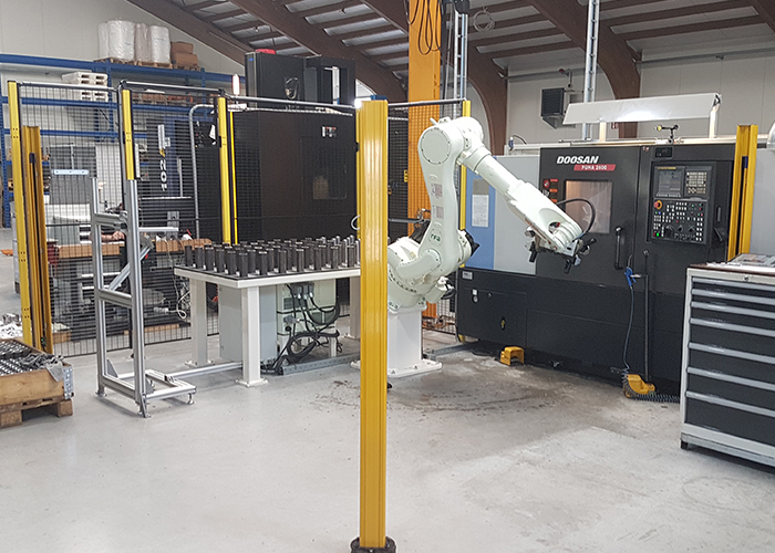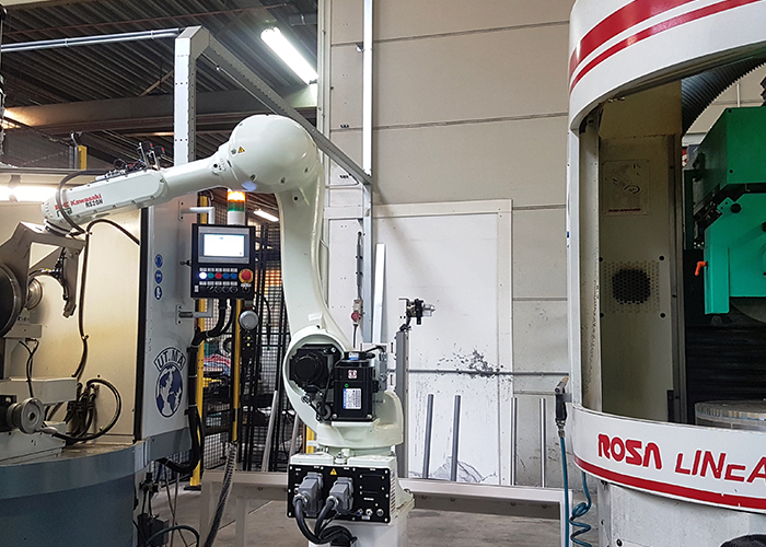 Voor de broers René en Alfons Van der Vegt is de Doosan Puma 2600 geautomatiseerd door middel van een grote robot met 80 kg hanteringsgewicht. De Kawasaki RS080NFE02 robot met een flink bereik met een diameter van 4.200 mm hanteert ook de zwaardere werkstukken probleemloos. Ondanks de grotere robot is de machine vrij toegankelijk voor de operator doordat de robot onder een hoek geplaatst is. Naast de aanvoer op een werkstuktafel met raster worden gezaagde delen direct door middel van een magneetgrijper aan de robot van euro pallet genomen waardoor ze niet door de operator gehanteerd hoeven worden. De gerede werkstukken worden door de robot op een tweede euro pallet geplaatst.