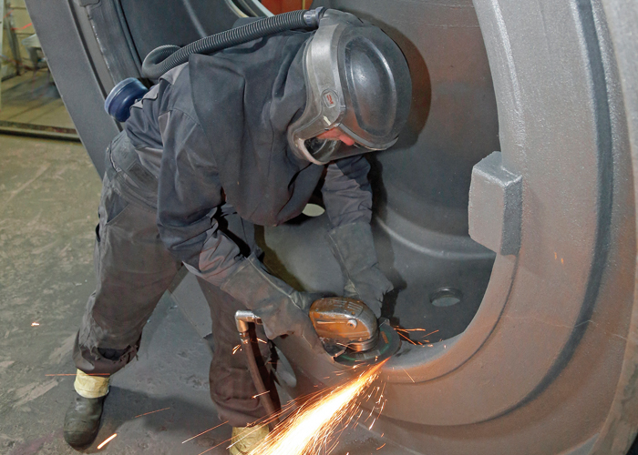 ”Sinds 2010 gieten wij alle grote en belangrijke componenten voor de generatoren van Enercon zelf. Zo blijven de transportwegen voor de productie kort. Dat levert ecologische voordelen op en onze competentie voor deze doorslaggevende onderdelen blijven in huis”, licht Bliesner toe. “Machinedragers, statorklokken, rotornaven of astappen met gewichten van tot wel 16 ton zijn de typische producten.” Het GZO produceert wekelijks tot wel 70 van deze zwaargewichten in serieproductie. Het hoofd van de afdeling is er zich van bewust dat de bewerking van de metershoge ruwe onderdelen het gebruikte gereedschap extreem belast. “Vooral de slijpmachines worden hier echt hard aangepakt”, bekent Bliesner. “Ons speciale sferogietwerk is een bijzonder taai materiaal, dat bij het afslijpen van de bramen en het voorbewerken van de oppervlakken alles van het gereedschap vergt.” In drieploegendienst, vijf dagen per week komen de haakse slijpers op netto-gebruikstijden van 15 tot 18 uur per dag.